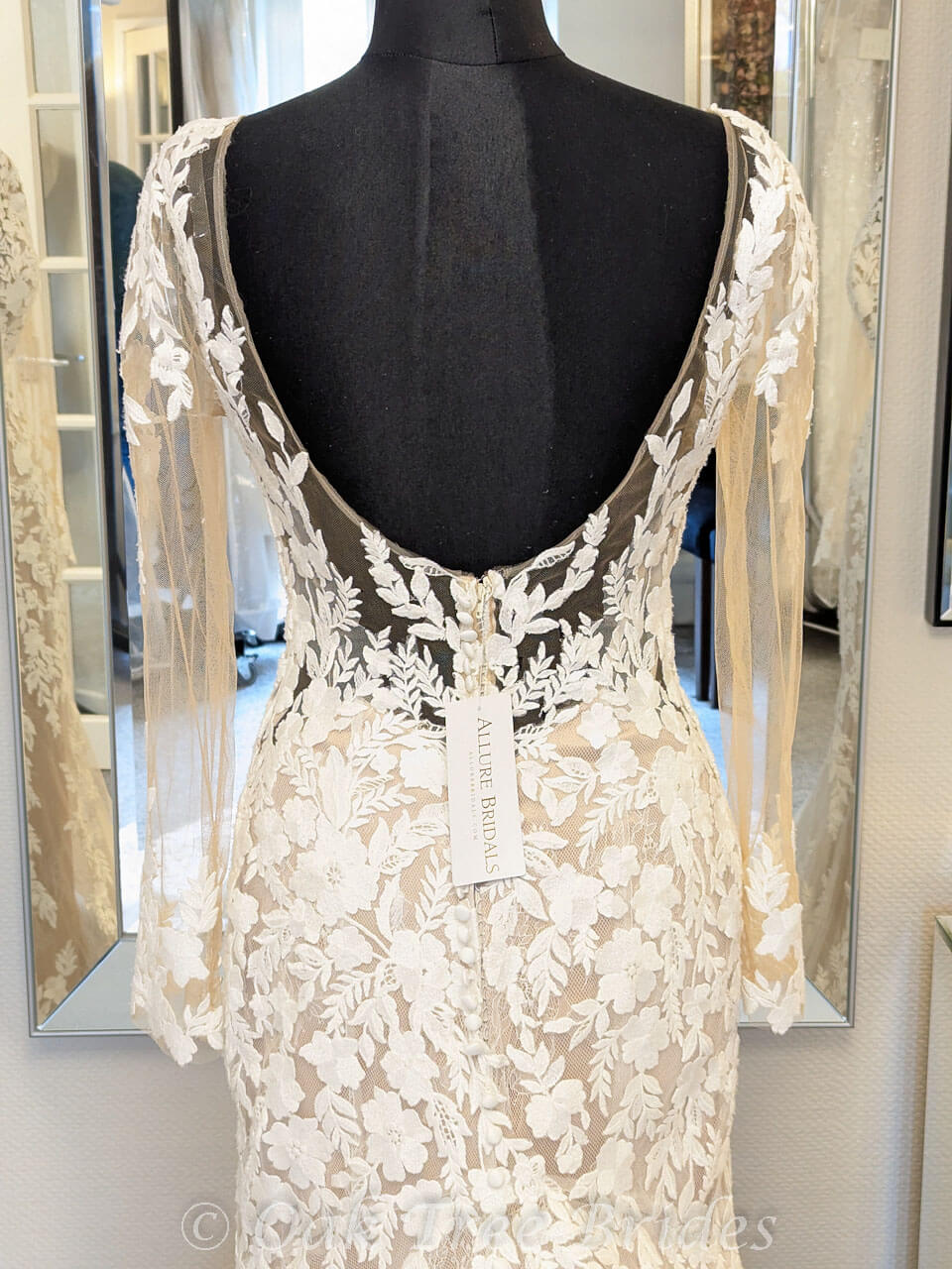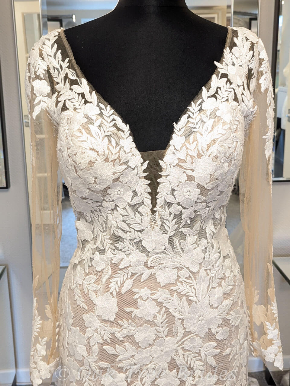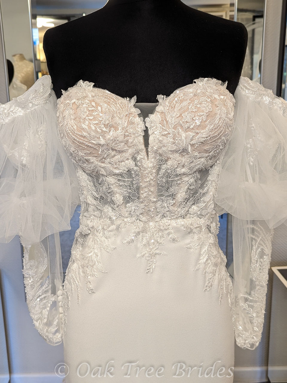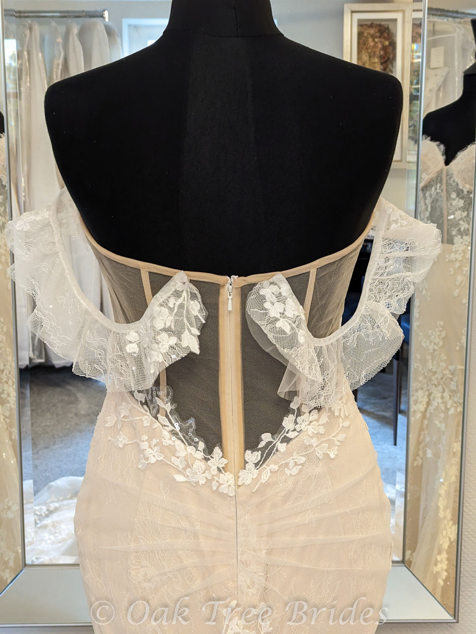 Description : A floral lace fit and flare wedding dress with boned bodice, sweetheart neckline and ruffled off the shoulder straps.