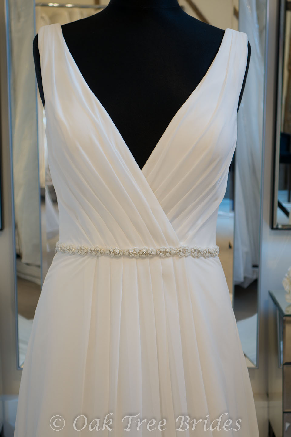 Description : An A-line wedding dress in flowing chiffon and crepe. Plunging V-neckline and deep V-back embellished with attached crystal belt.