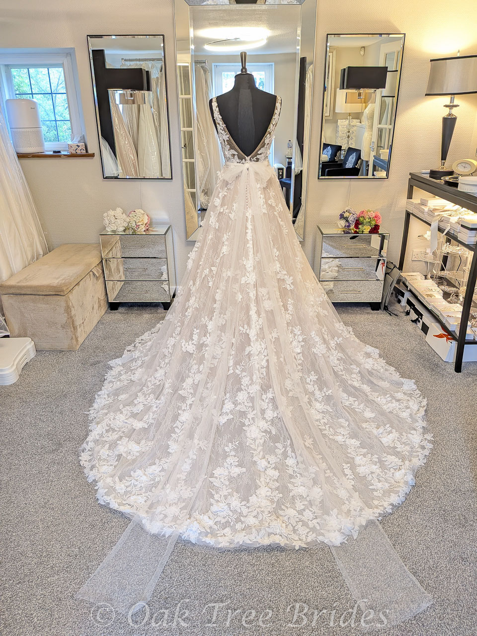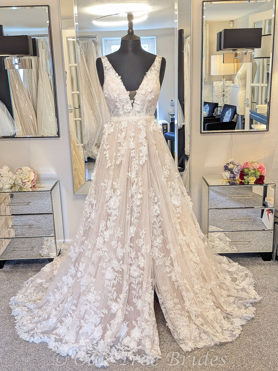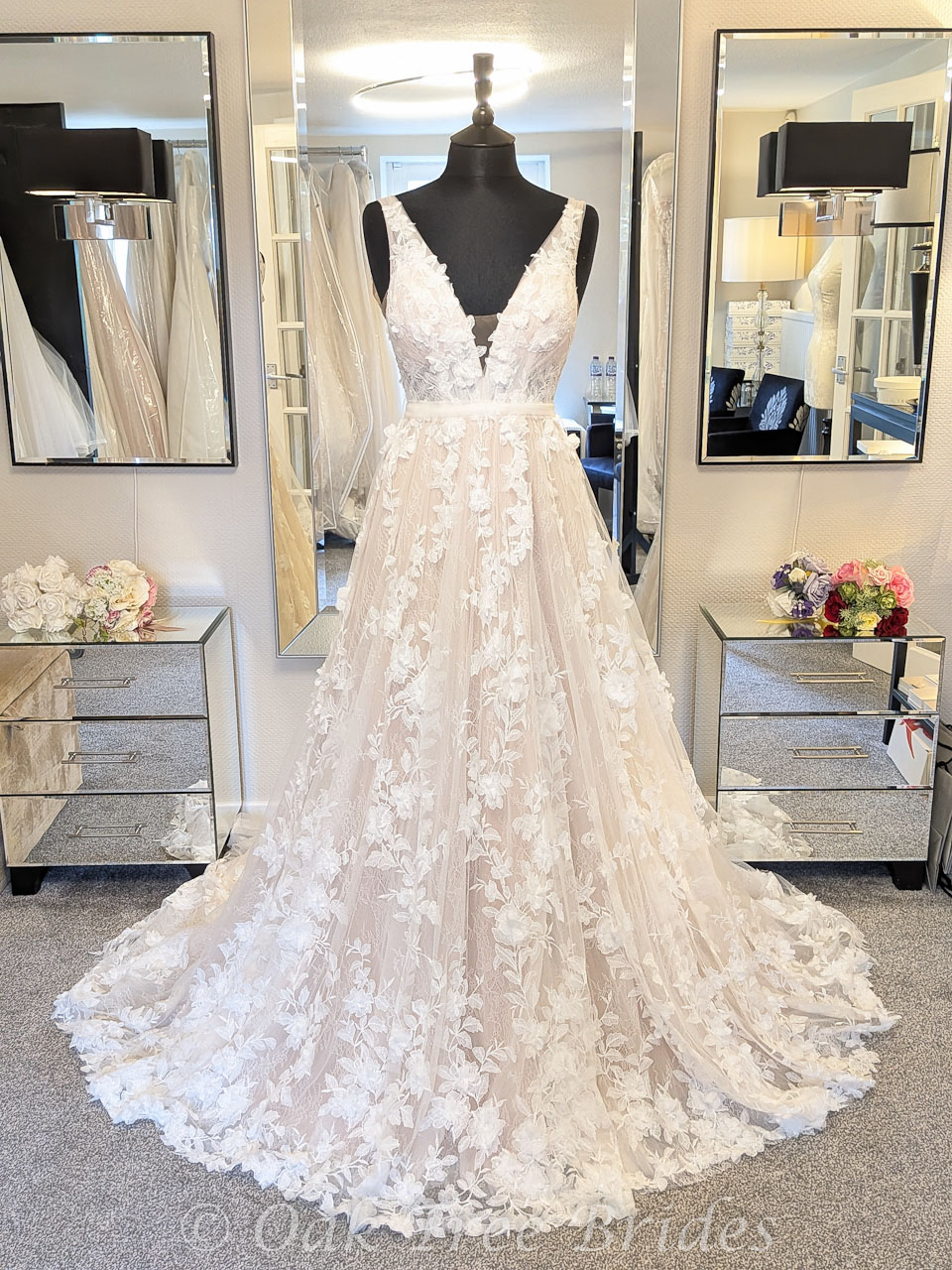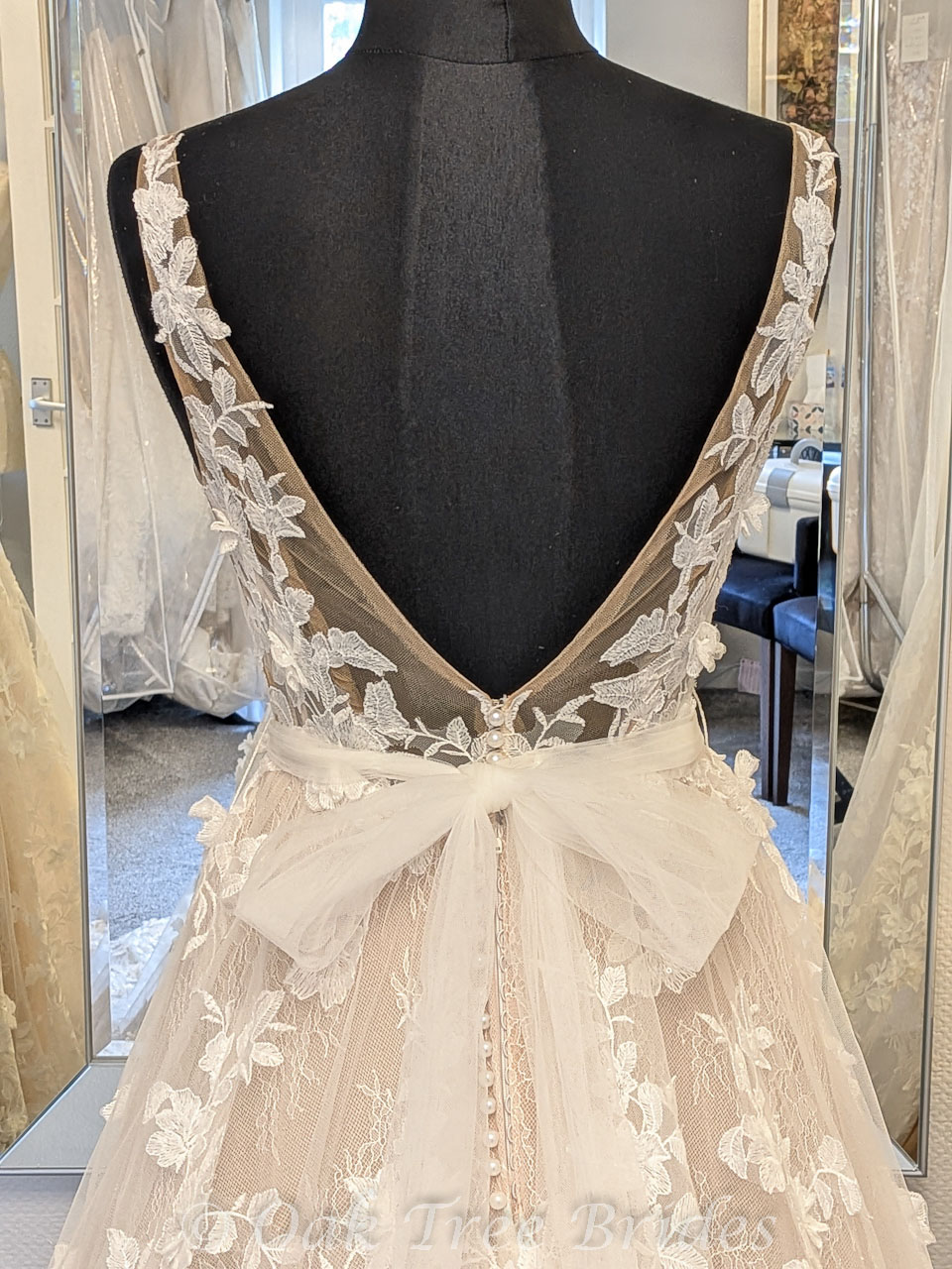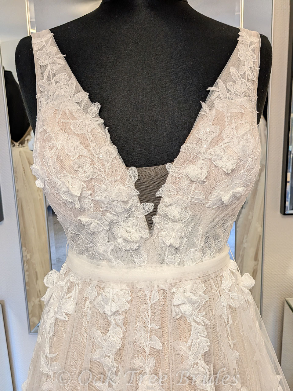 Description : A romantic, lace A-line gown with delicate 3D floral embellishments, plunging V-neckline, side cutouts, detachable tulle bow and skirt split.