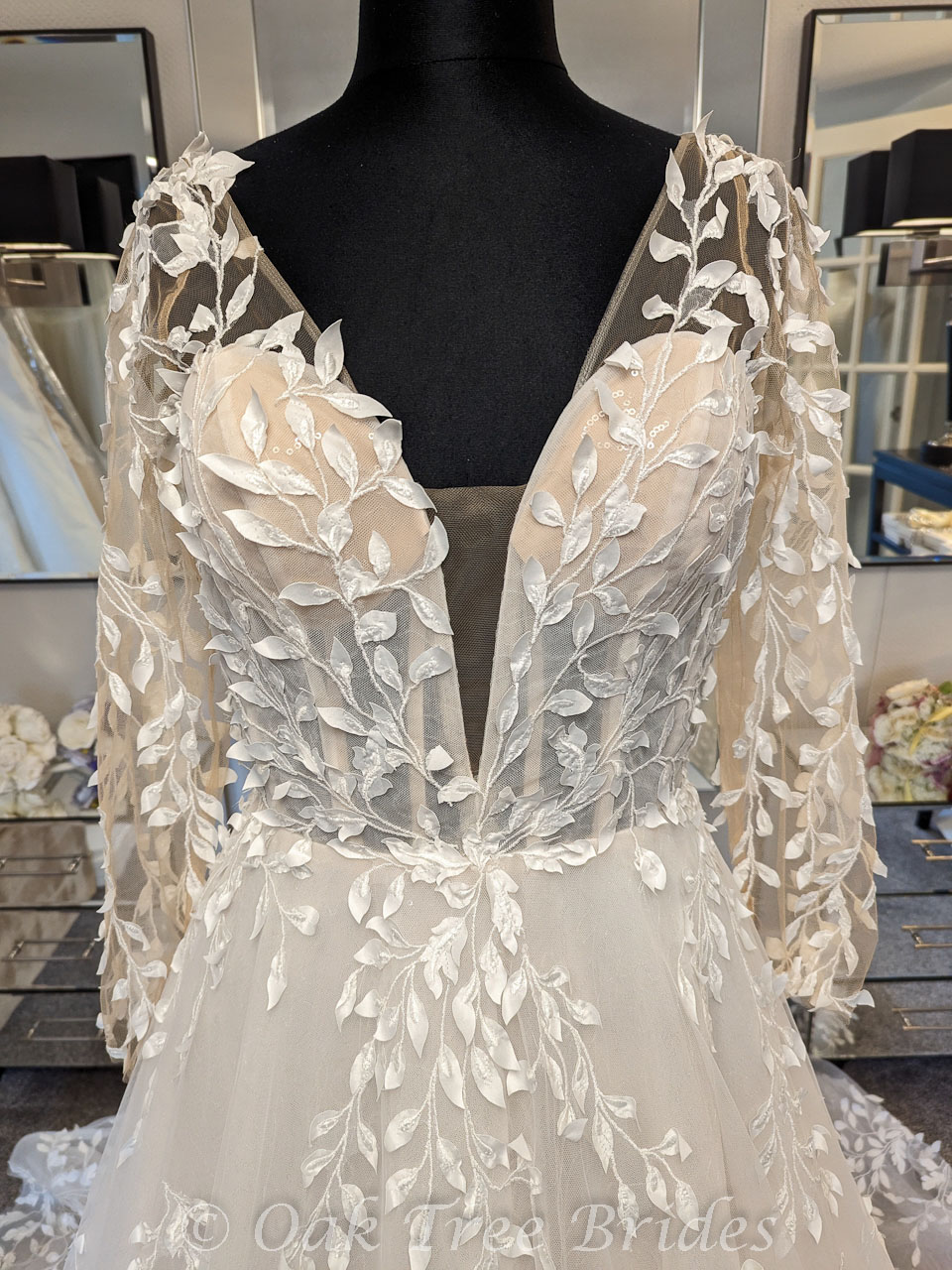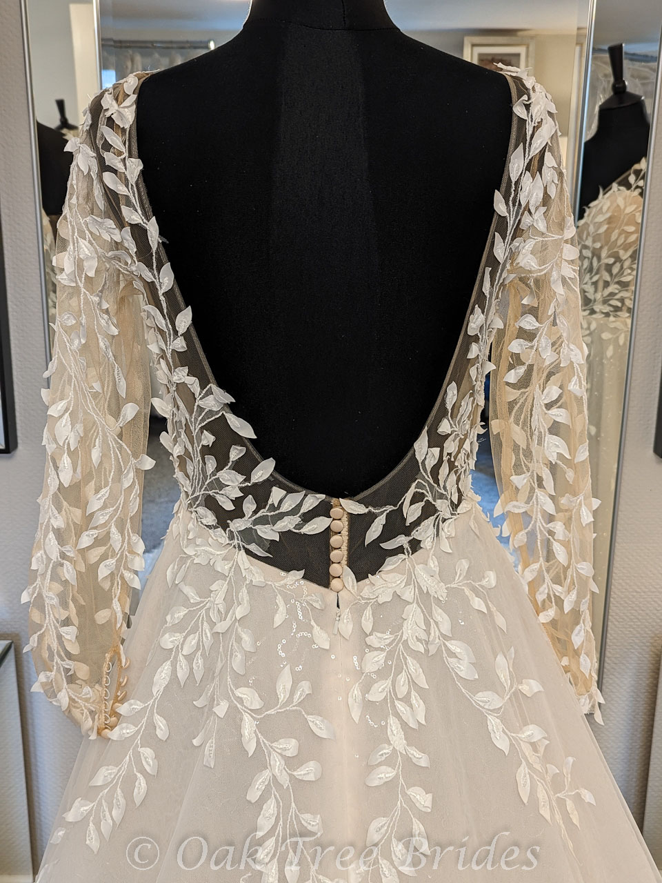 Description : A sequinned tulle ballgown with leaf appliques and sleeves.