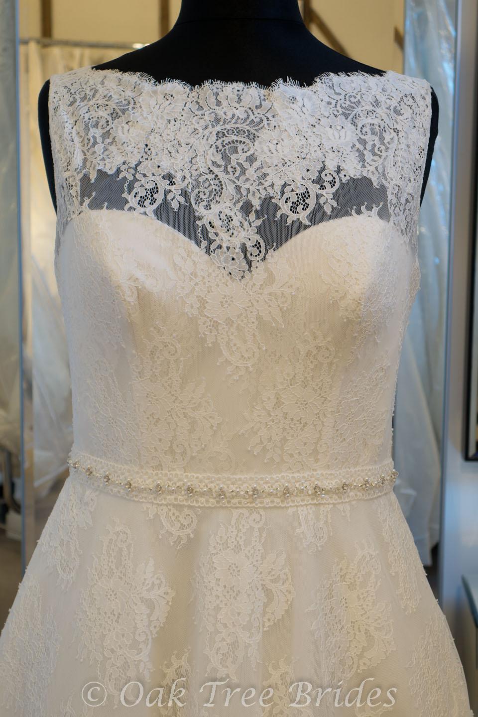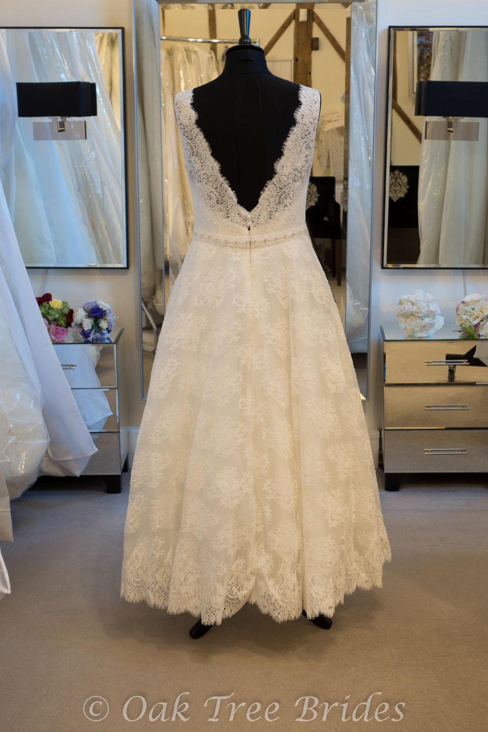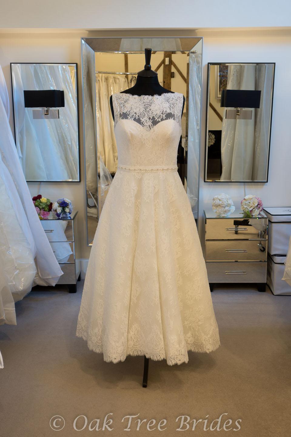 Description : A tea length lace wedding dress with illusion neckline and V-back. Pretty beaded belt attached at waist.