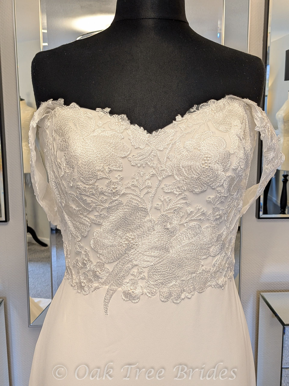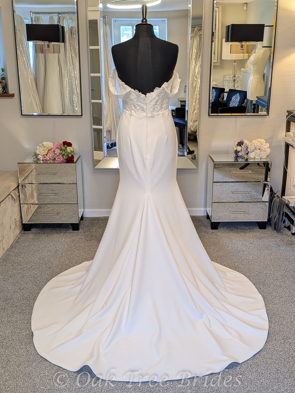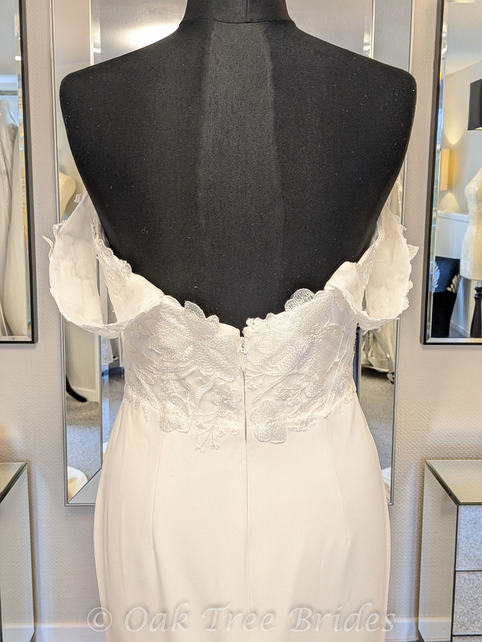 Description : A fit and flare gown with lace bodice and form-fitting crepe skirt. Features a sweetheart neckline and off the shoulder lace sleeves.