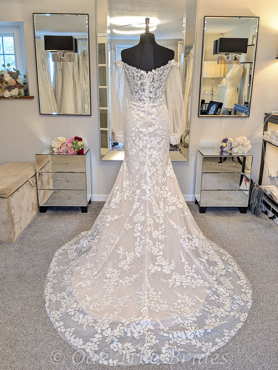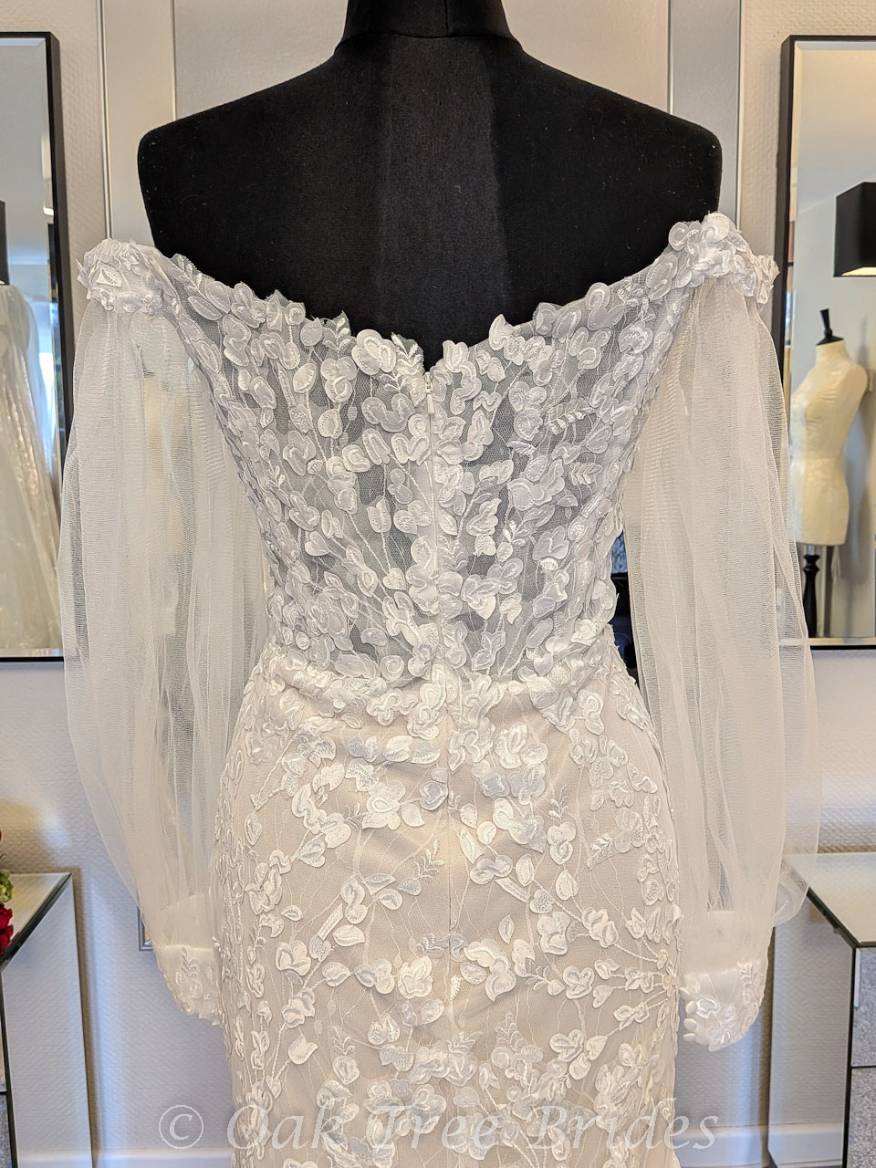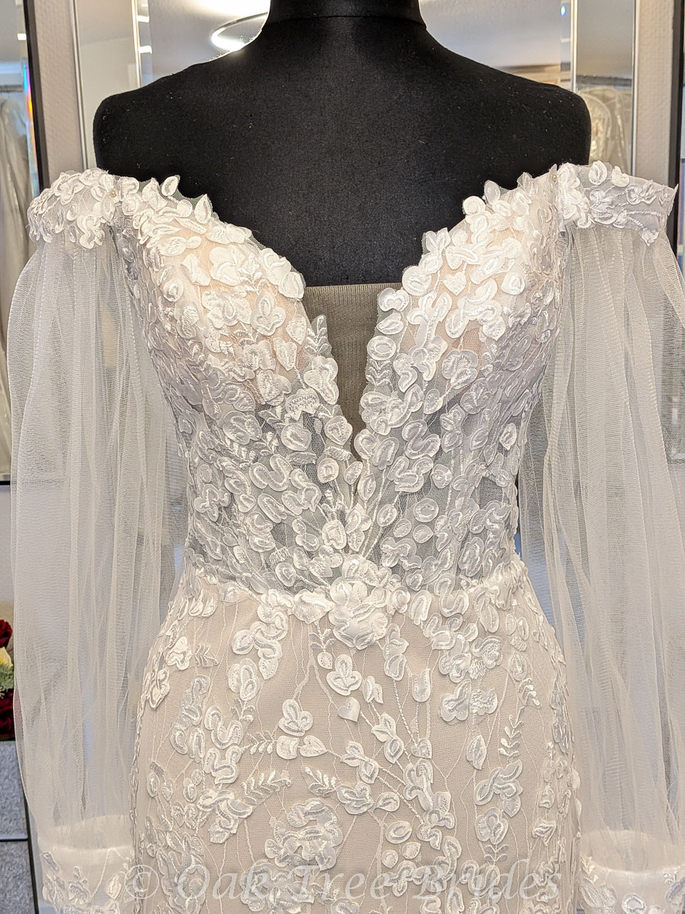 Description : A fit and flare gown in floral lace with off-the-shoulder, sheer bishop sleeves.