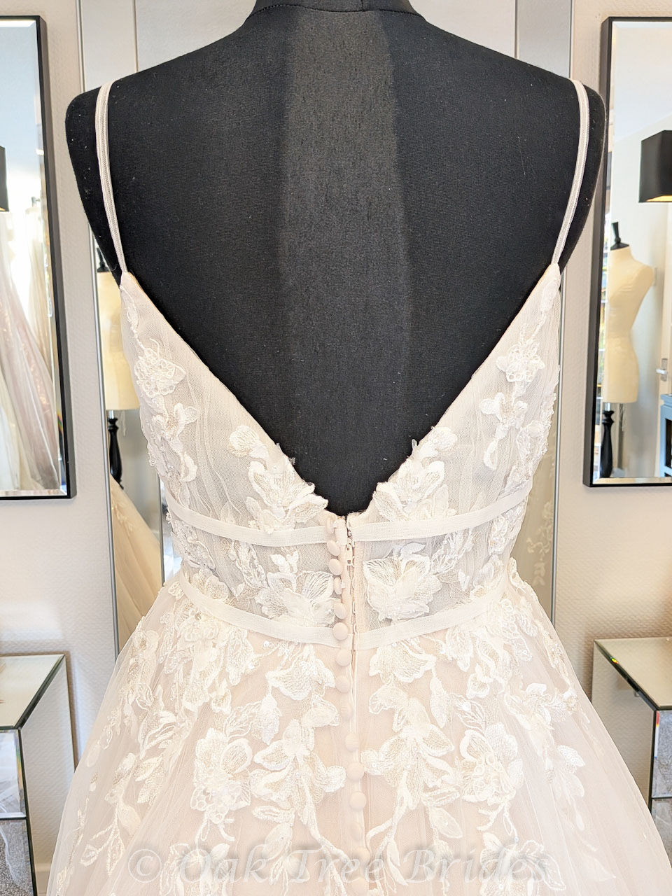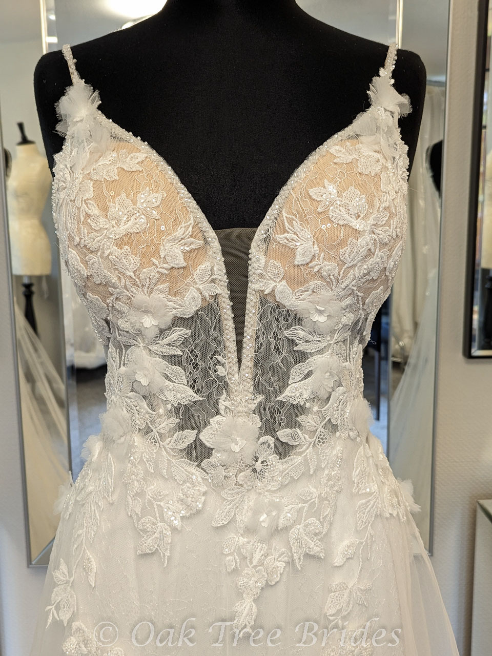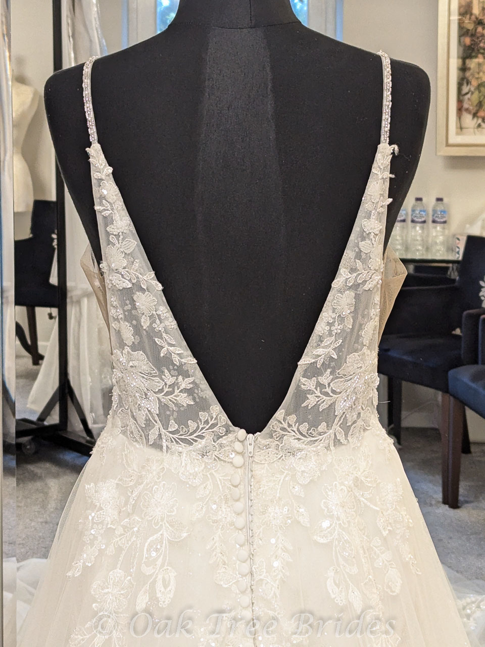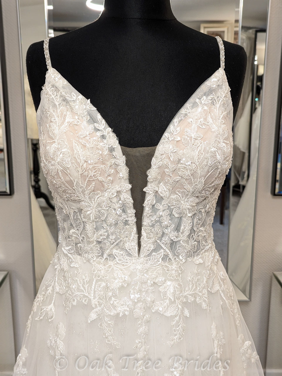 Description : A soft A-line gown in sparkling lace with beaded spaghetti straps, plunging V-neckline and deep V-back.