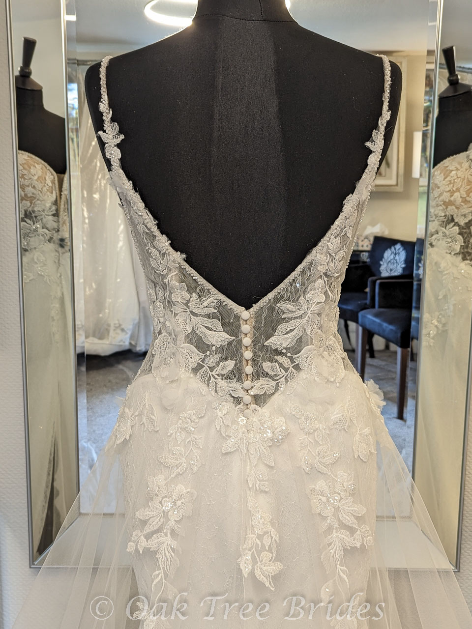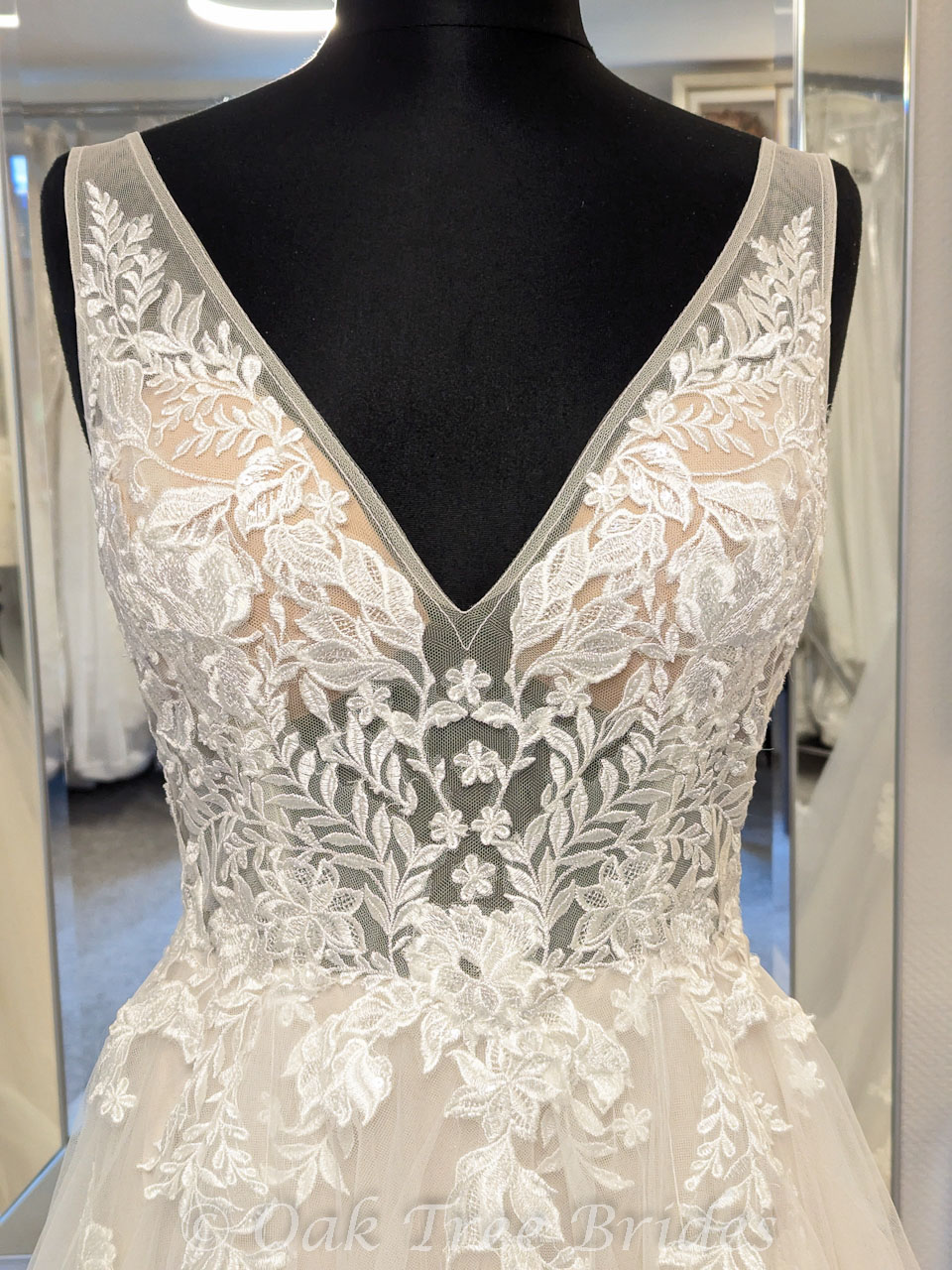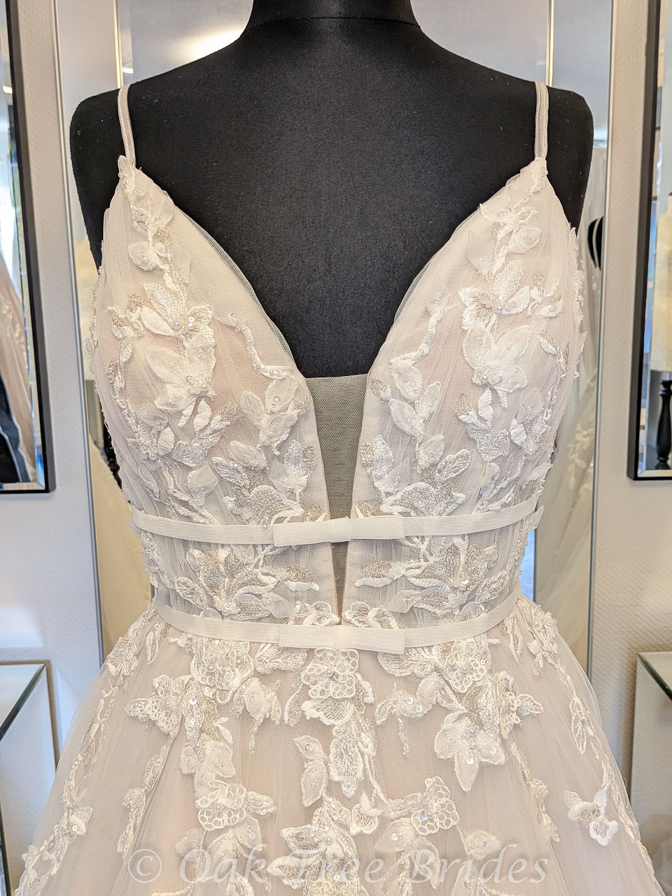 Description : A soft A-line gown in sparkling lace with beaded spaghetti straps, plunging V-neckline and deep V-back.