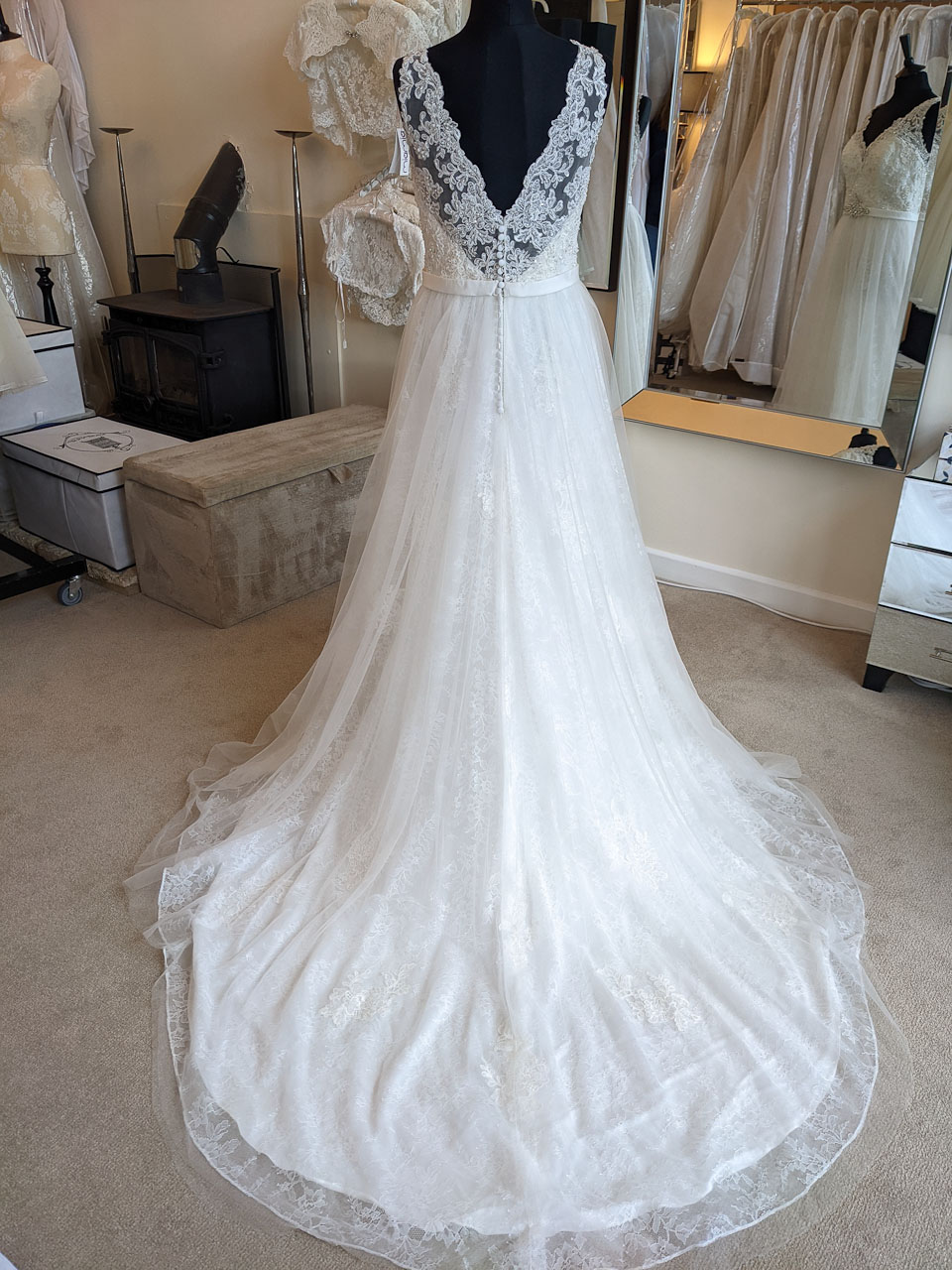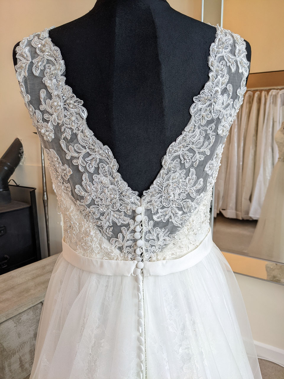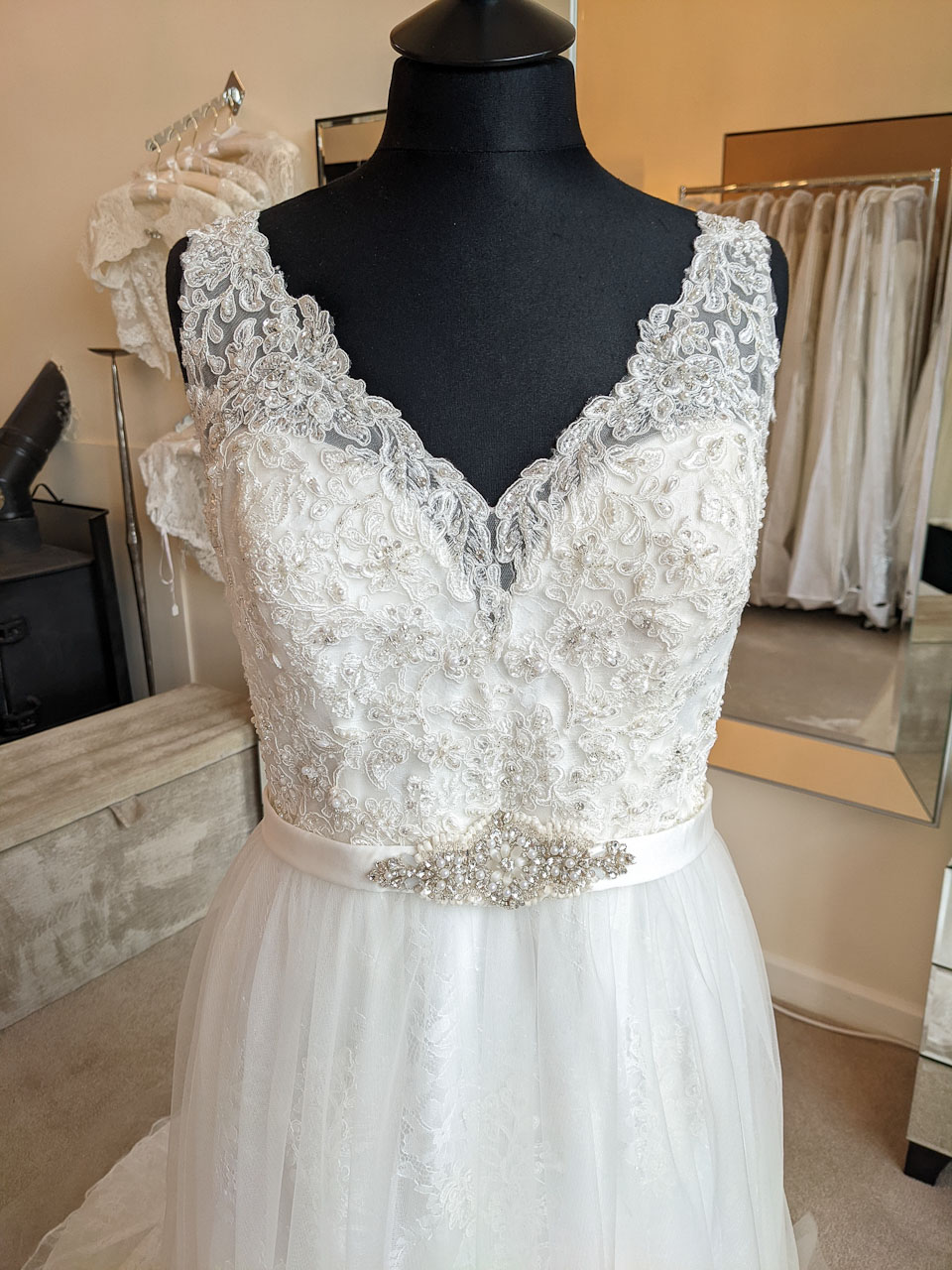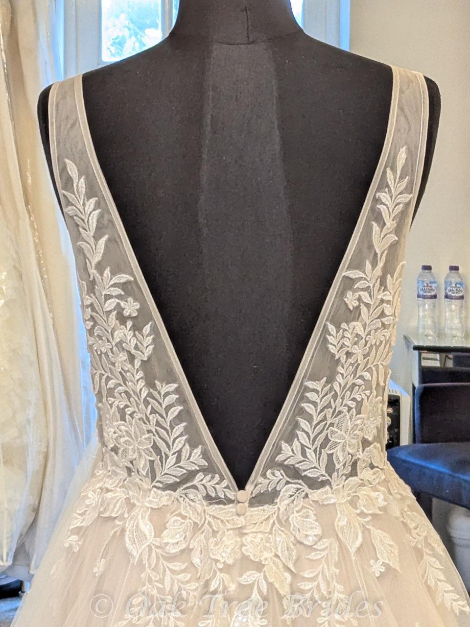 Description : A soft A-line gown in sparkling lace with beaded spaghetti straps, plunging V-neckline and deep V-back.