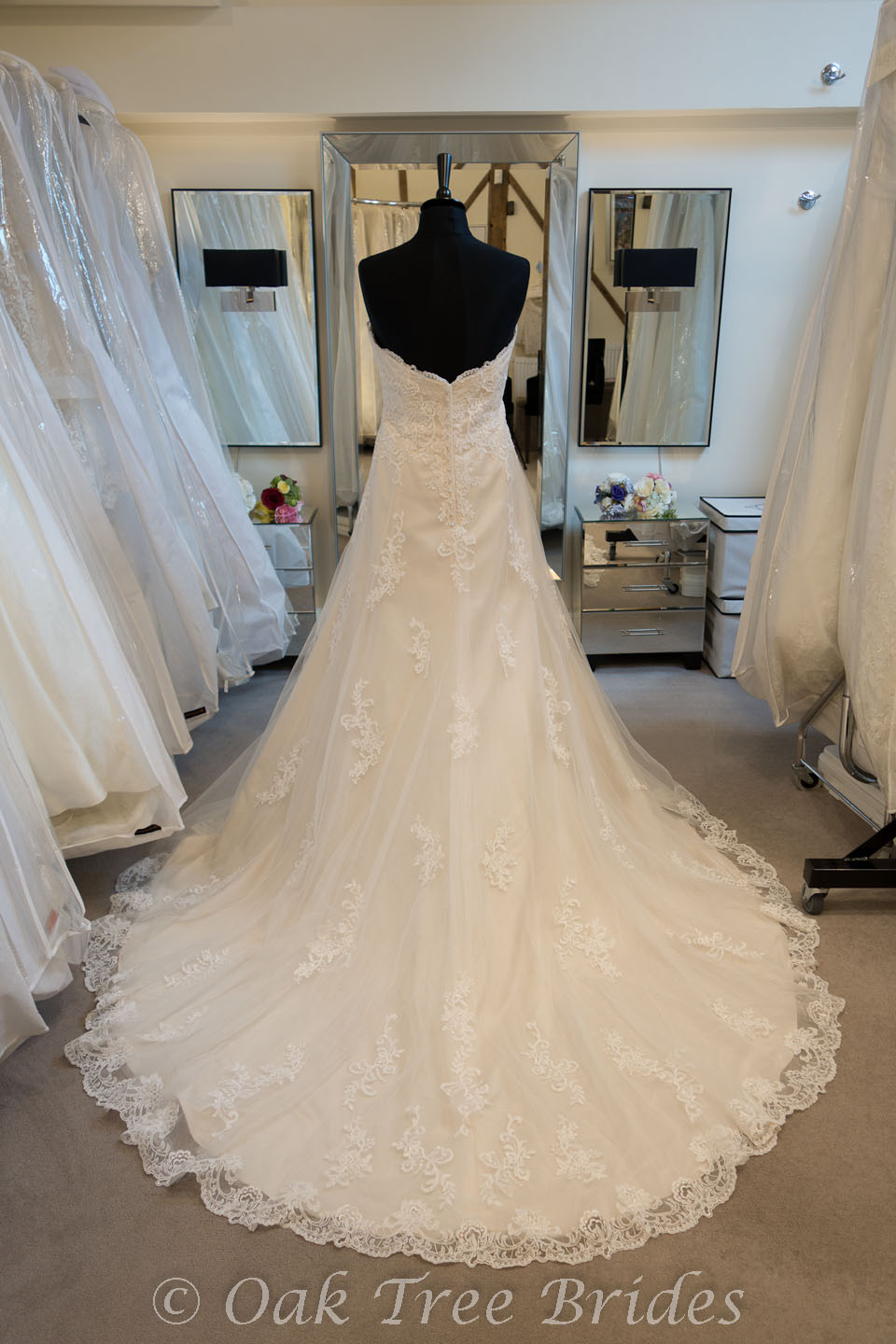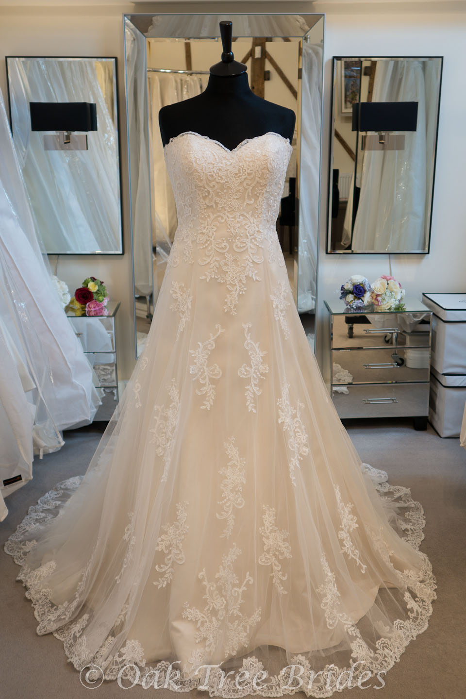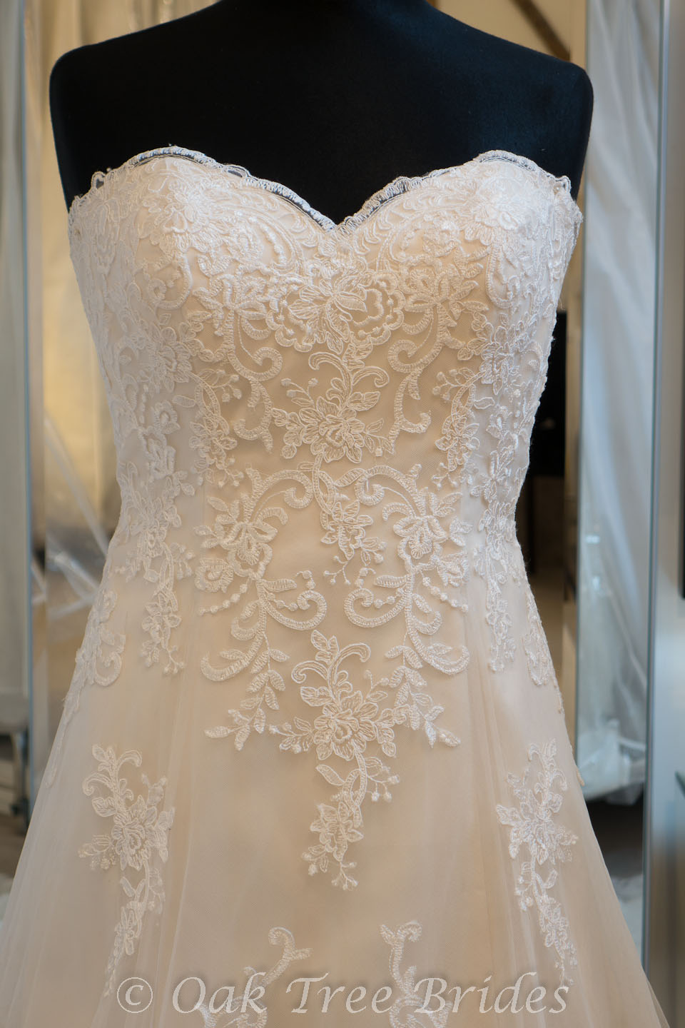 Description : An A-line gown in gold satin with ivory lace over. Sweetheart neckline and chapel train.