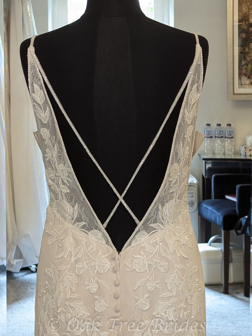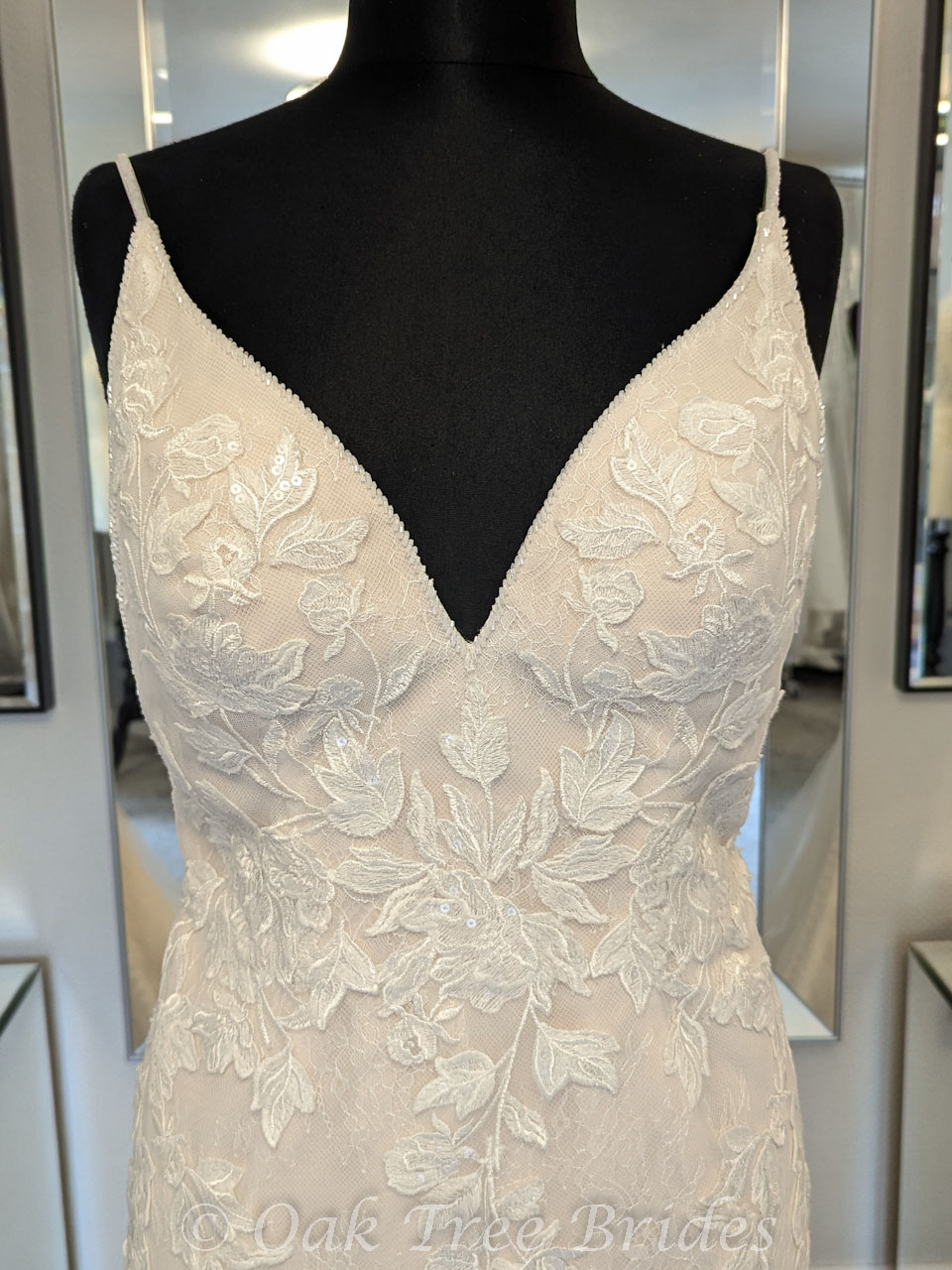 Description : A fit and flare wedding dress in floral lace with V-neckline, side cutouts and beaded straps.