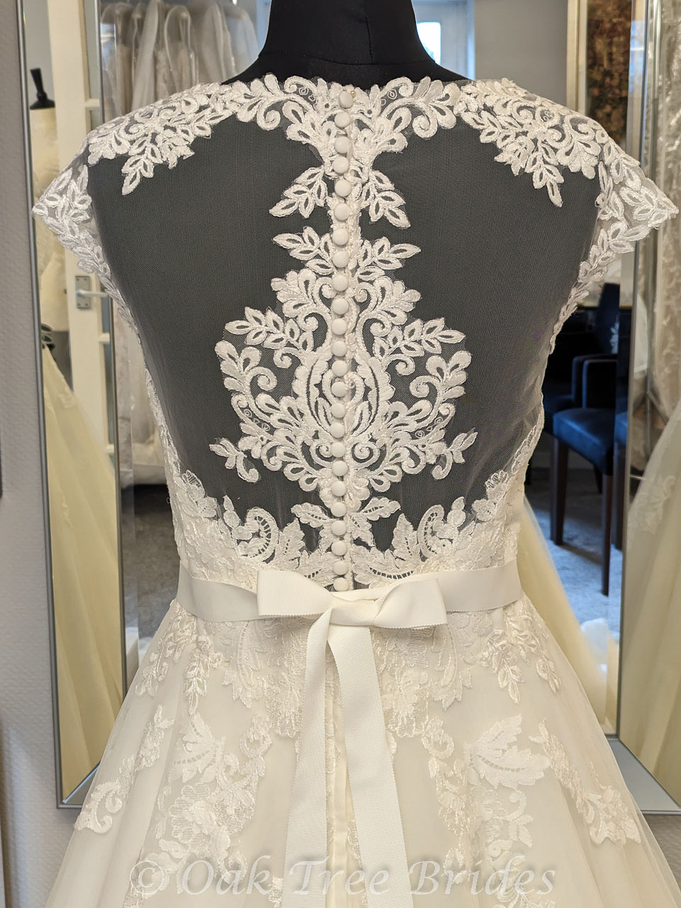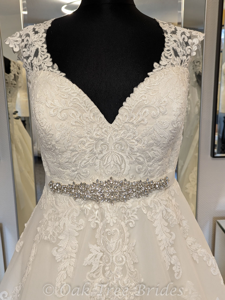Description : A lace and tulle, A-line gown with cap sleeves, deep sweetheart neckline, illusion back with lace motif and detachable crystal belt.